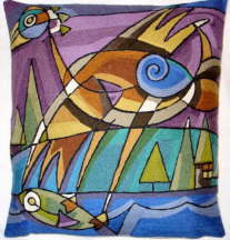 Cushion cover, hand chainstitched design by Manitoba Canada artist Shirley Lloyd-Davies. Canvas backing with wool embroidery. 18x18"